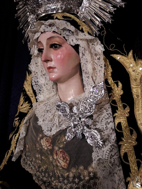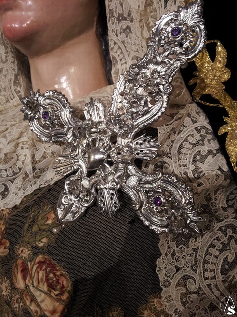 Realizado según las técnicas tradicionales de la orfebrería sevillana, en el centro del mismo aparece un corazón traspasado por siete puñales, sujetos por dos querubines y timbrado por una corona. El diseño general de la pieza está basado en la Cruz que remata la corona de plata que posee la Hermandad, llevando flores en bulto redondo y también pedrería de amatistas.