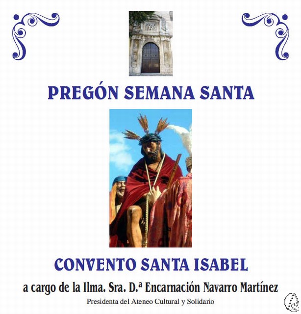 Arte Sacro. El 15 de marzo a las 20 horas, tendrá lugar el Pregón de Semana Santa del Convento Santa Isabel, calle Hiniesta n.º 2, a cargo de Encarnación Navarro Martínez, Presidenta del Ateneo Cultural y Solidario.