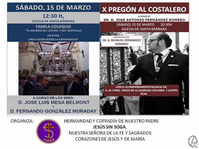 Ese mismo sábado 15 de marzo, a las 20:30 de la tarde, y también en la iglesia de Santa Bárbara, se celebrará por tanto el X Pregón al Costalero que correrá a cargo de nuestro querido y admirado Sr. D. José Antonio Fernández Romero, Diputado Mayor de Gobierno de la Hermandad de la Expiración de Écija, capataz del misterio de Ntro. Padre Jesús Nazareno de la Misericordia de la misma hermandad y también capataz del paso de palio de María Stma. de la Amargura de la Hermandad del Silencio.