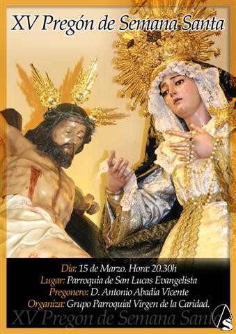 Arte Sacro. Como viene siendo habitual por estas fechas, y en plena cuaresma, el Grupo Parroquial Virgen de la Caridad organiza, en su XV edición, el Pregón de la Semana Santa; cuyo pregonero, este año, será el actual coordinador, Antonio Abadía Vicente, el cual será presentado por el pregonero del año pasado, José Manuel Talavera Martín-Albo.