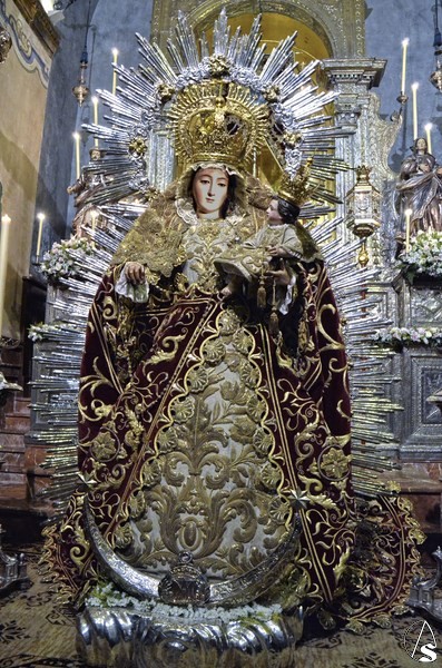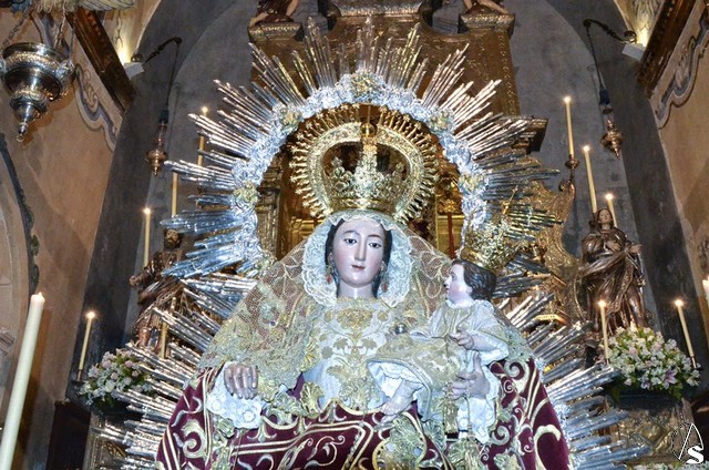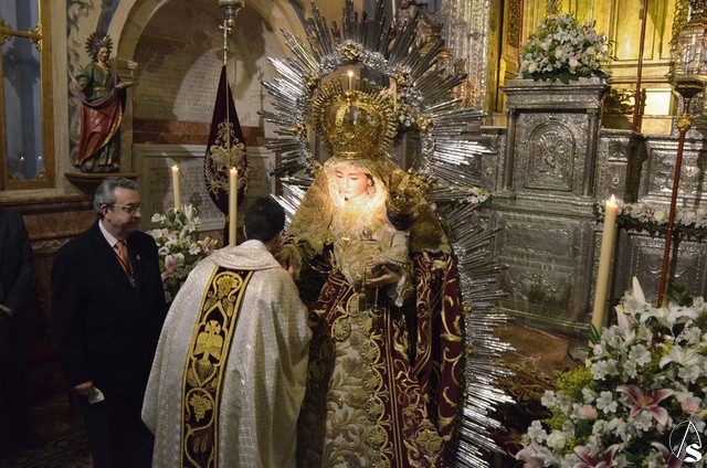 El besamanos de la Virgen de la Alegría en su parroquia de San Bartolomé nos ha regalado la estampa de la recuperación del manto renacentista que llevaba años intentándose restaurarse y que, por fin, el taller de Fernández y Enríquez ha llevado a buen puerto.