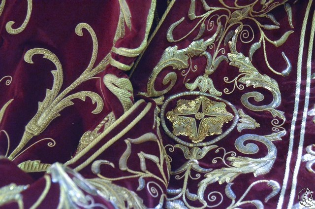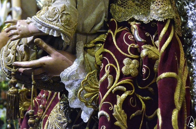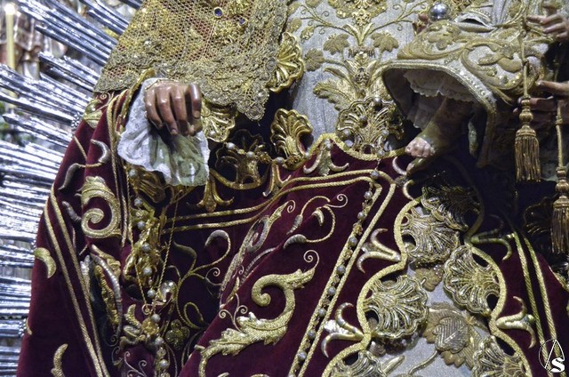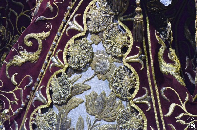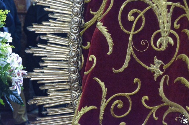 El manto, de terciopelo granate, fue confeccionado en 1924 por Eduardo Rodríguez Gutiérrez, es de estilo renacentista, con remate realizado en todo su perímetro por veneras de hojilla sobre malla.