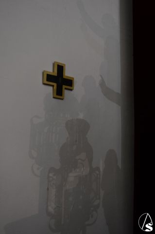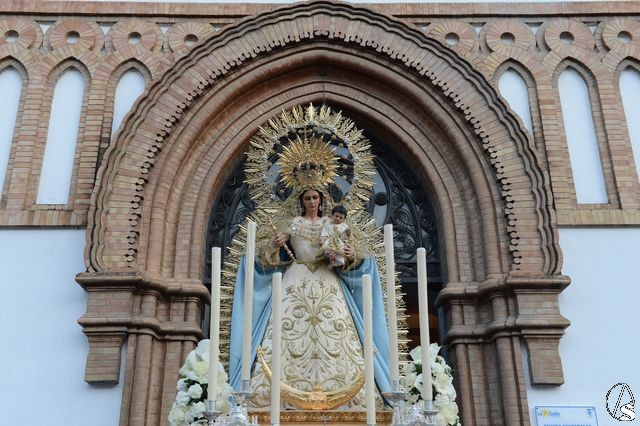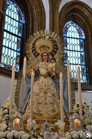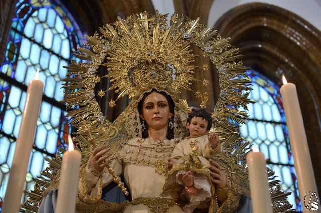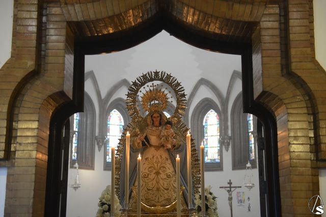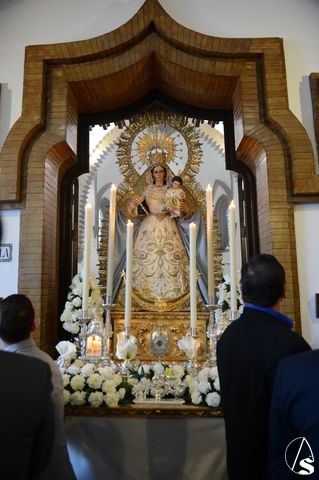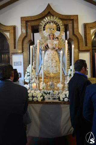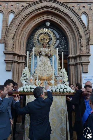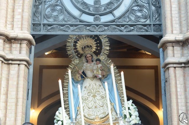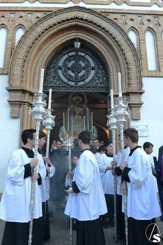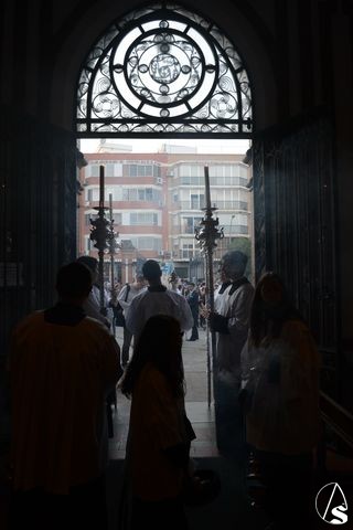 Las andas con la Stma. Virgen, al mando de Ricardo Almansa, tuvieron que ser bajadas dos veces para poder salir por la puerta de la capilla y por la propia puerta del colegio, en una maniobra complicada.
