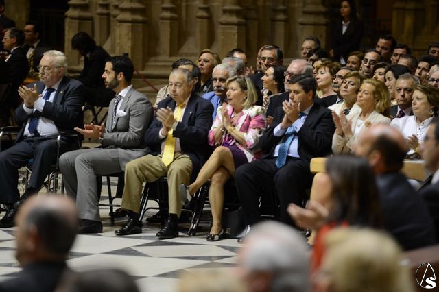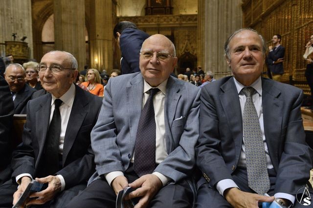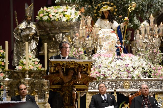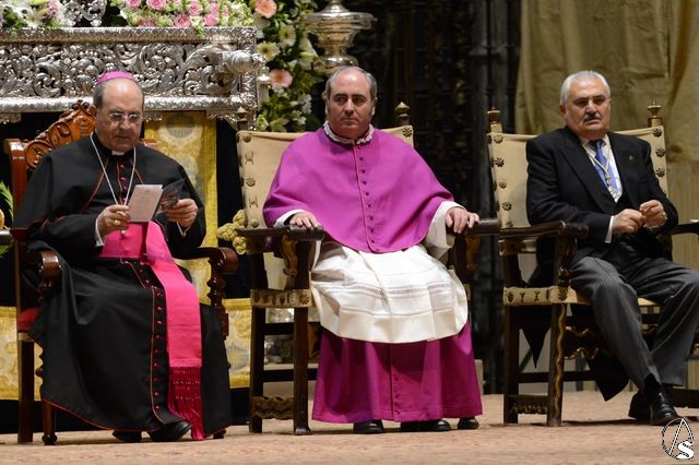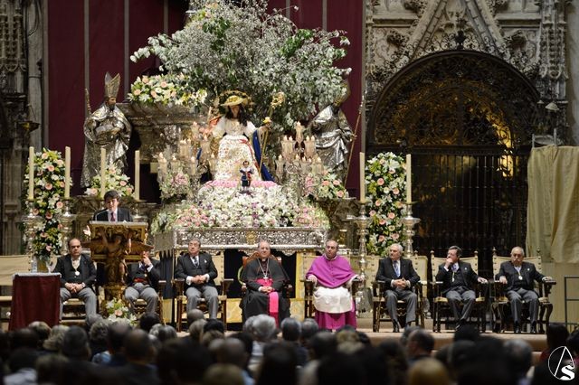 En la presidencia del acto estuvieron el arzobispo de Sevilla, Juan José Asenjo Pelegrina, con el delegado episcopal de hermandades y cofradías, Manuel Soria Campos, el alcalde de Sevilla, Juan Ignacio Zoido, la junta superior del consejo de cofradías, y el delegado de Fiestas Mayores y presentador del pregonero, Gregorio Serrano, que tuvo unas palabras cariñosas hacia su amigo Carlos Crivell.