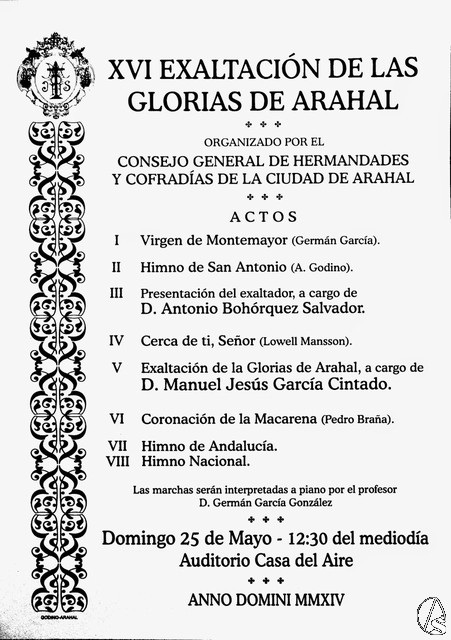 Arte Sacro. El próximo día 25 de mayo a las 12:30 horas de la tarde en el Auditorio de la Casa del Aire en la Calle Veracruz escucharemos la XXI Edición de la Exaltación de las Glorias de Arahal. Acto organizado por el Consejo General de Hermandades y Cofradías de la ciudad.