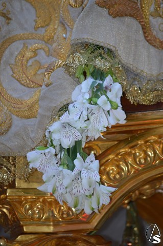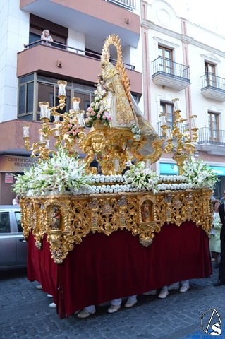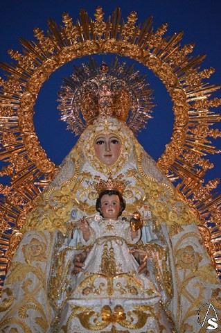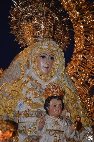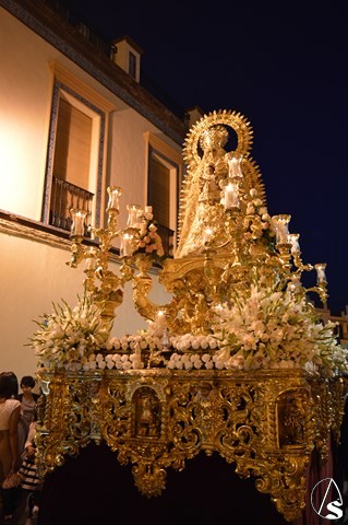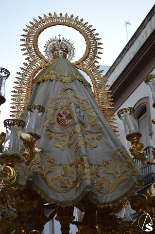 La Virgen del Dulce Nombre lucía saya y manto blanco bordado en oro, al igual que el Santísimo Niño. Porta corona de plata sobre dorada y ráfaga del mismo material. Tras el paso estuvo la Banda de Música Nuestra Señora del Águila de Alcalá de Guadaíra.