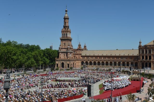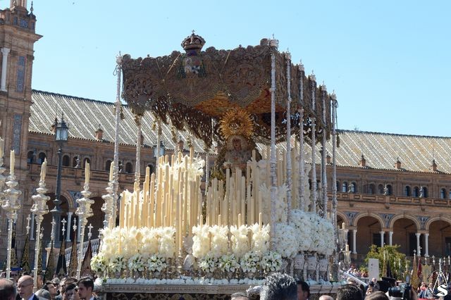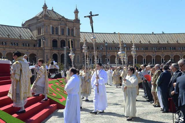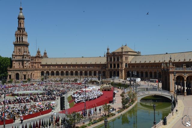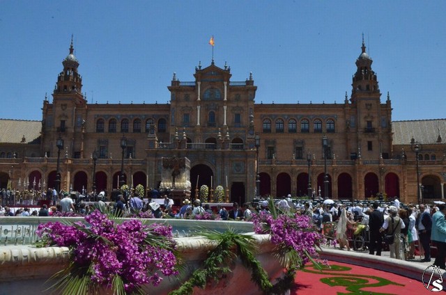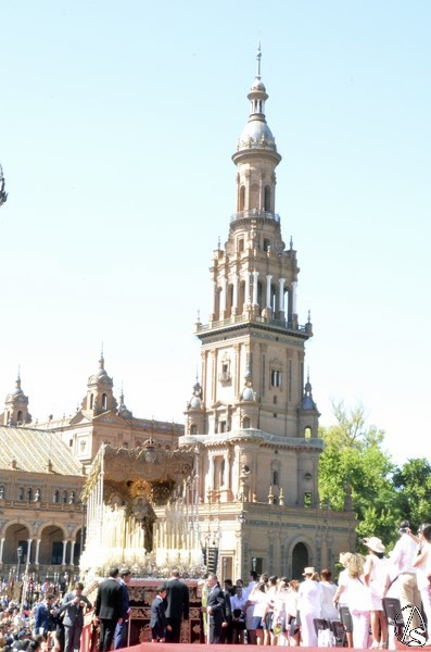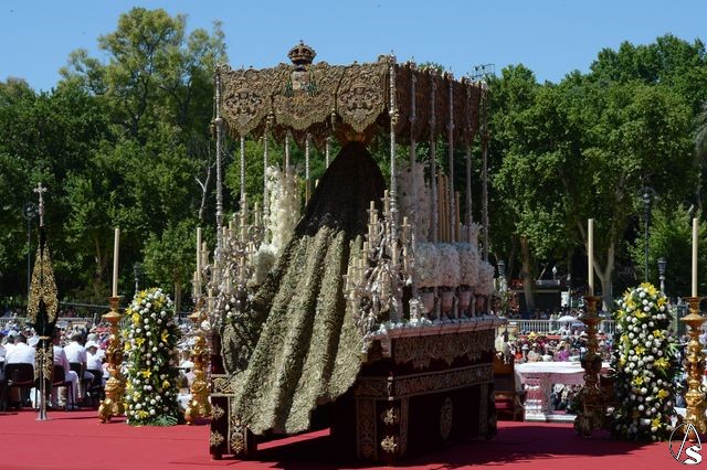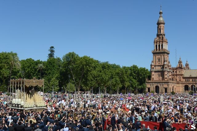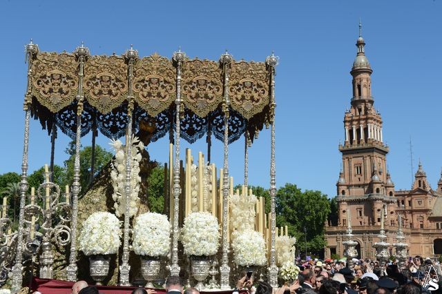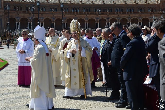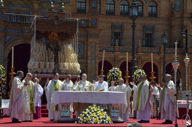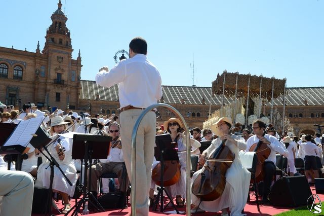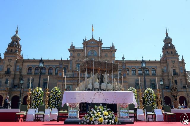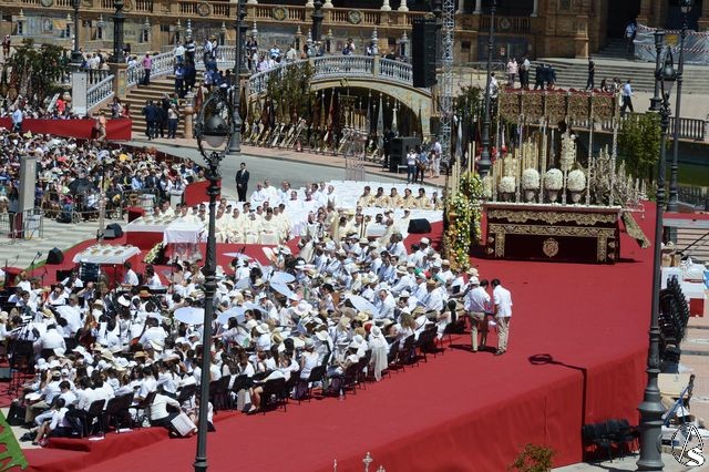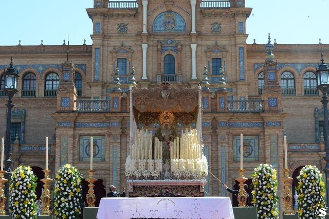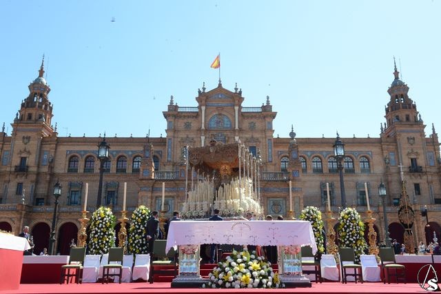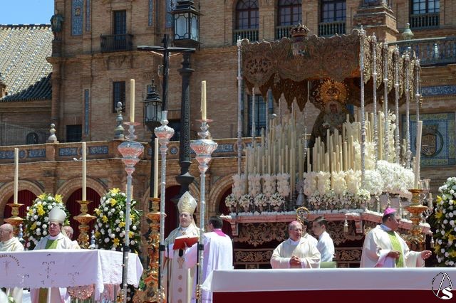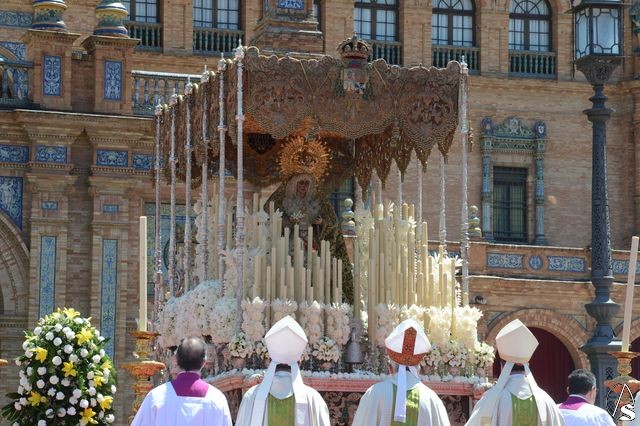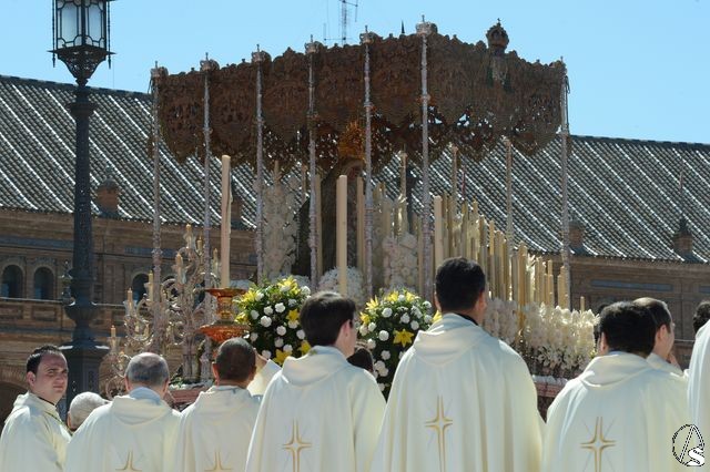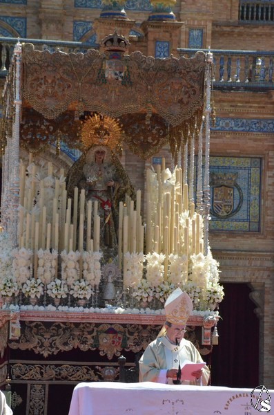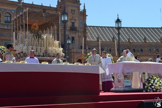 Sobre las 11,35 horas llegó a la Plaza de España donde les esperaba una orquesta sinfónica que interpretó la composición “ La Virgen de la Esperanza ” de Alberto Barea, de unos 20 minutos de duración, mientras el paso de la Señora llegaba hasta el sitio exacto desde donde presidiría la solemne misa estacional. Con el arzobispo de Sevilla y el obispo auxiliar estuvieron cinco obispos más, dos de ellos venidos desde Sudamérica.