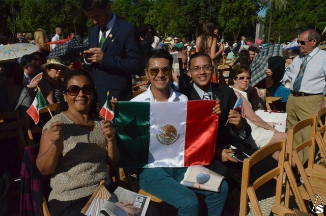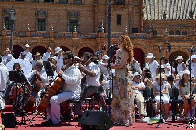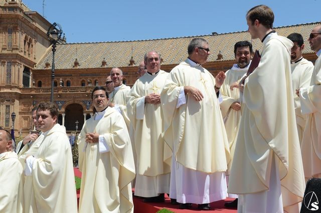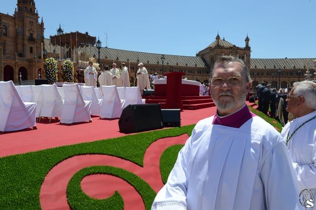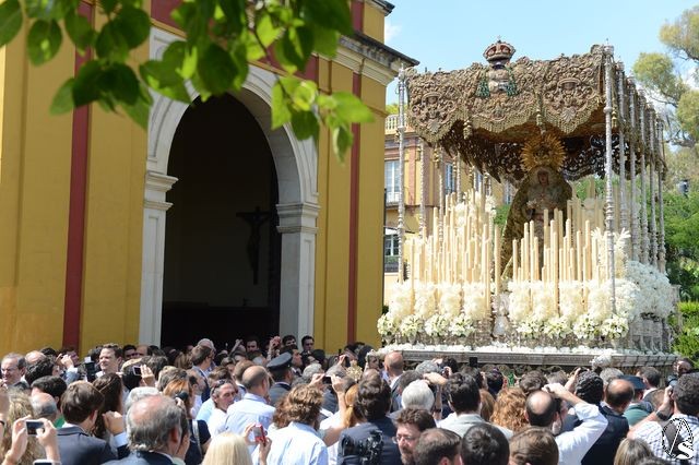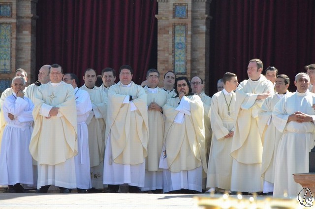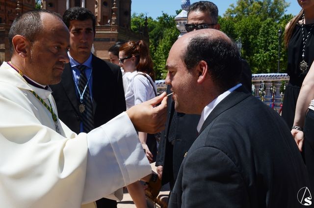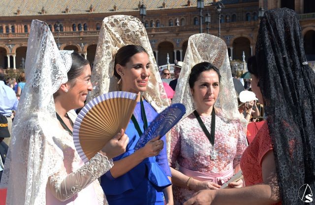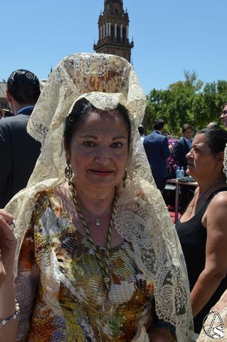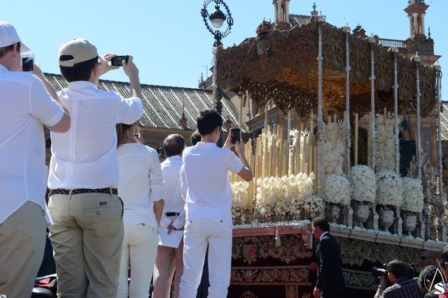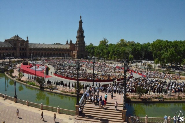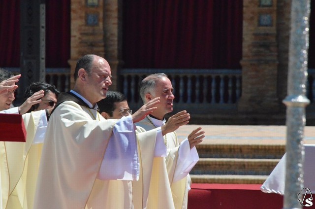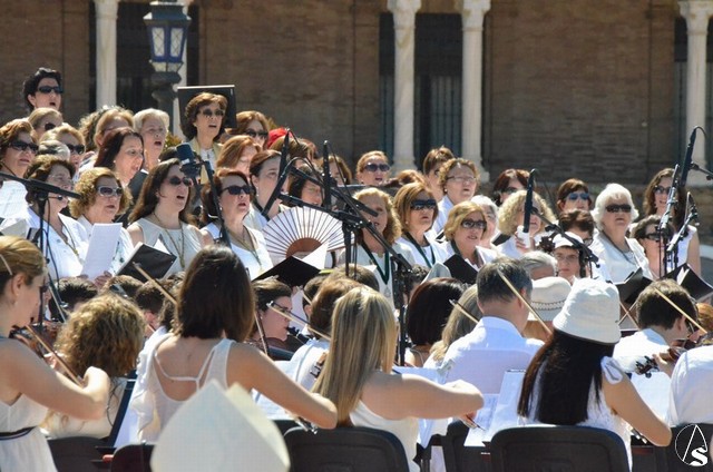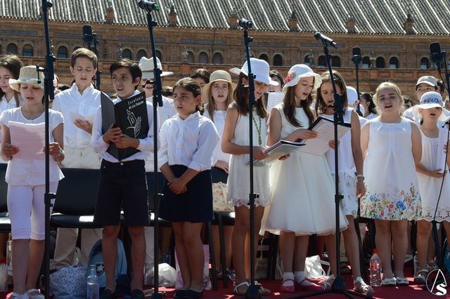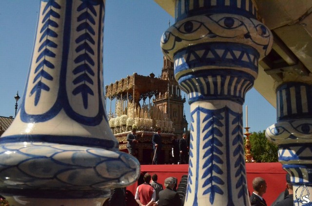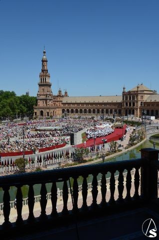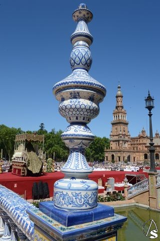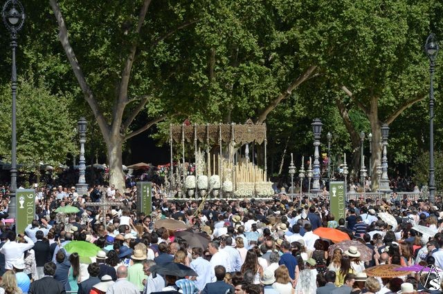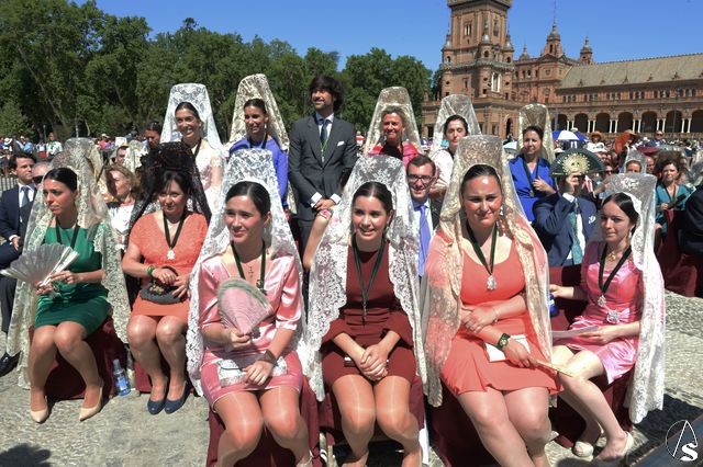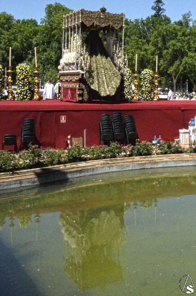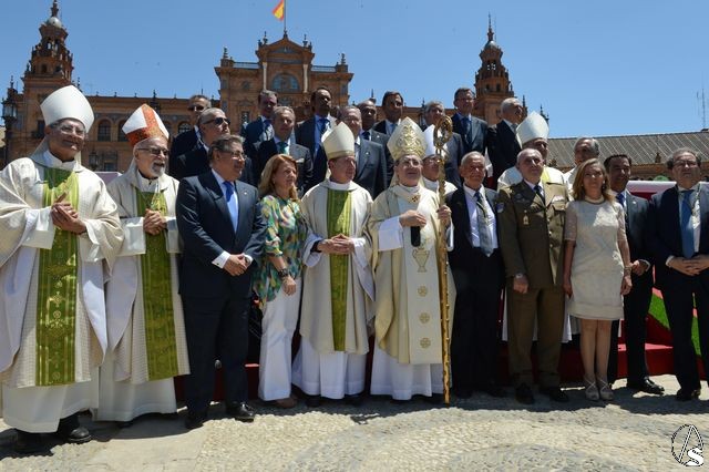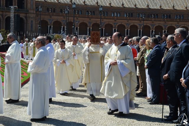 Sobre las 11,35 horas llegó a la Plaza de España donde les esperaba una orquesta sinfónica que interpretó la composición “ La Virgen de la Esperanza ” de Alberto Barea, de unos 20 minutos de duración, mientras el paso de la Señora llegaba hasta el sitio exacto desde donde presidiría la solemne misa estacional. Con el arzobispo de Sevilla y el obispo auxiliar estuvieron cinco obispos más, dos de ellos venidos desde Sudamérica.