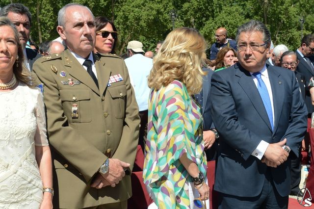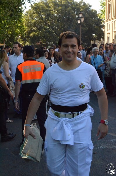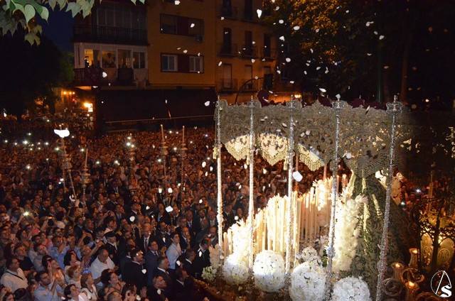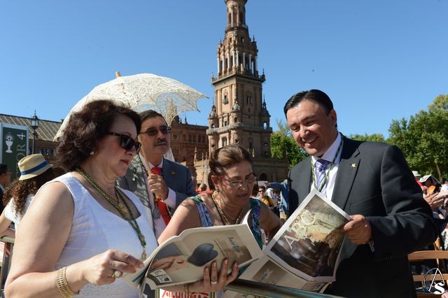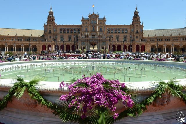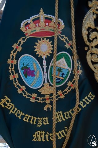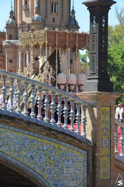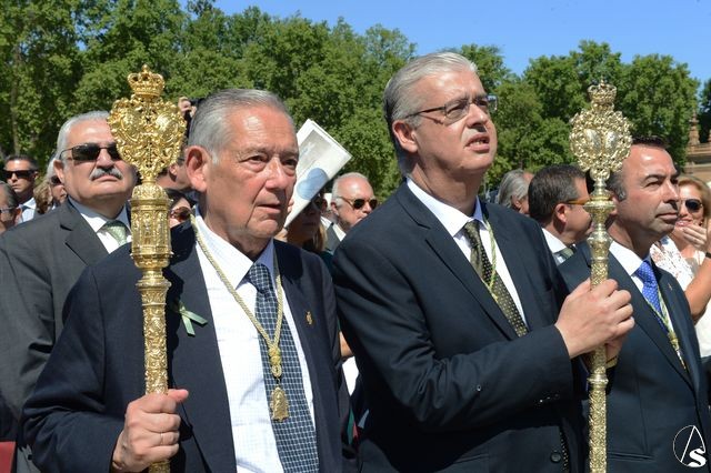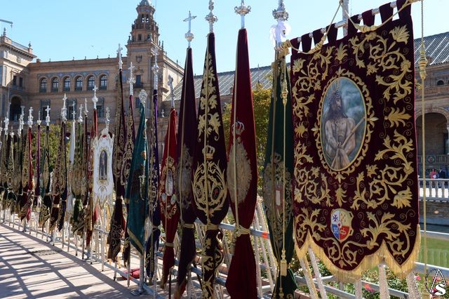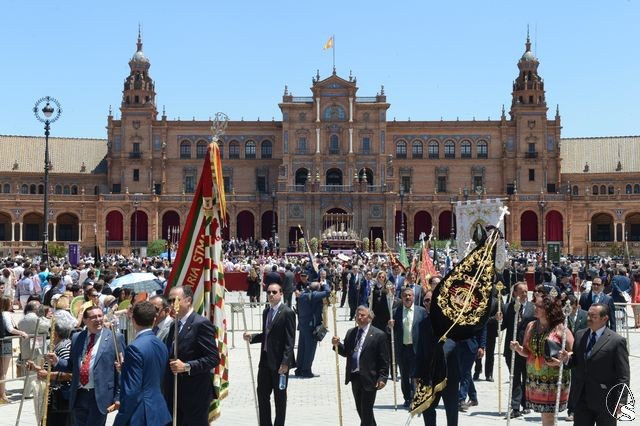 Los estandartes participantes formaron un numeroso cortejo, mientras el paso de la Virgen Macarena abandonaba la Plaza de España a los sones del pasodoble “Suspiros de España” nuevamente interpretada por la orquesta sinfónica.