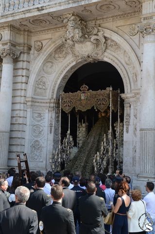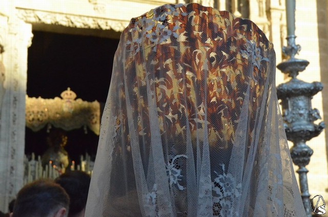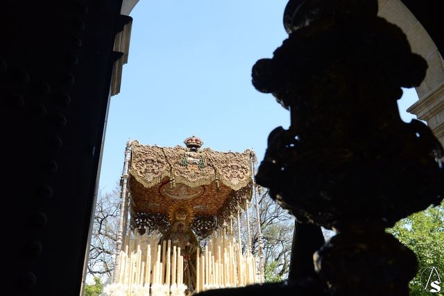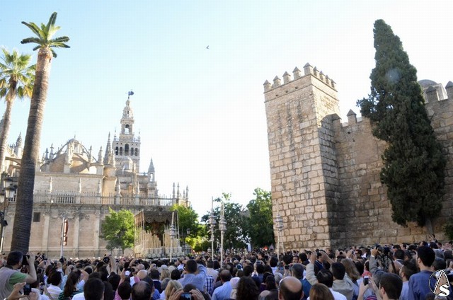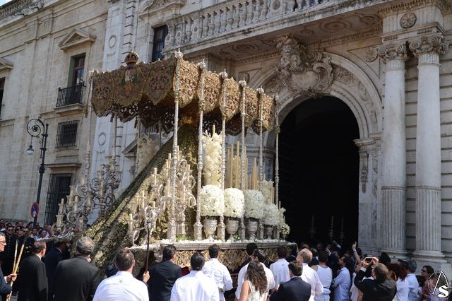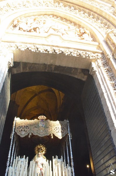 A las 8 de la mañana salía la Esperanza Macarena por la puerta de los Palos de la Catedral con el único acompañamiento de cortejo de la Cruz de Guía y el Estandarte.