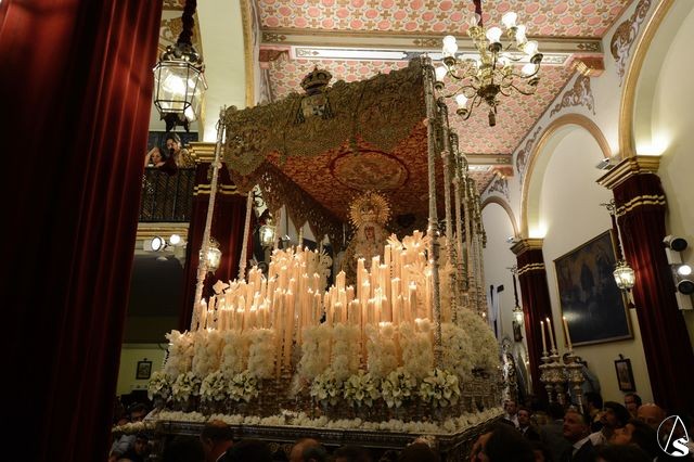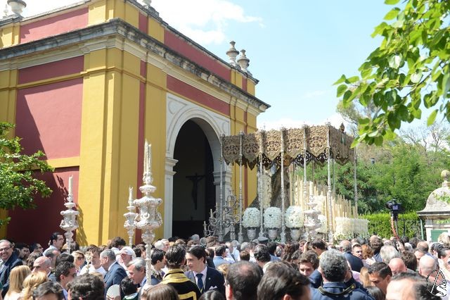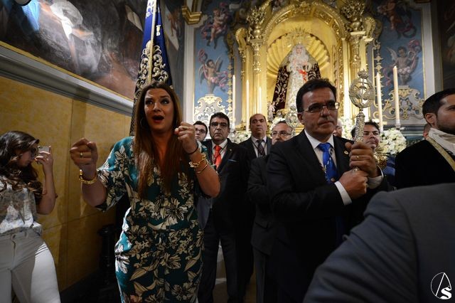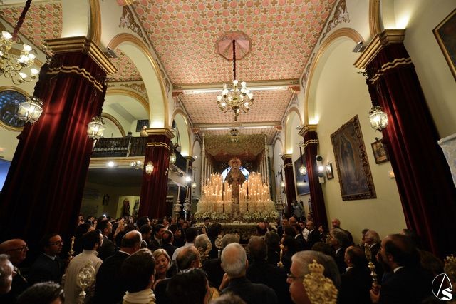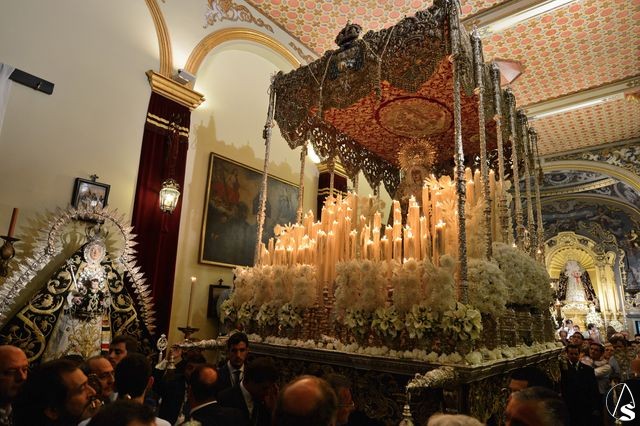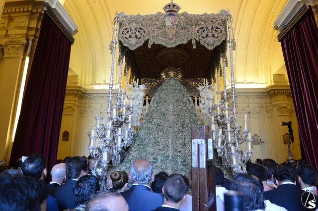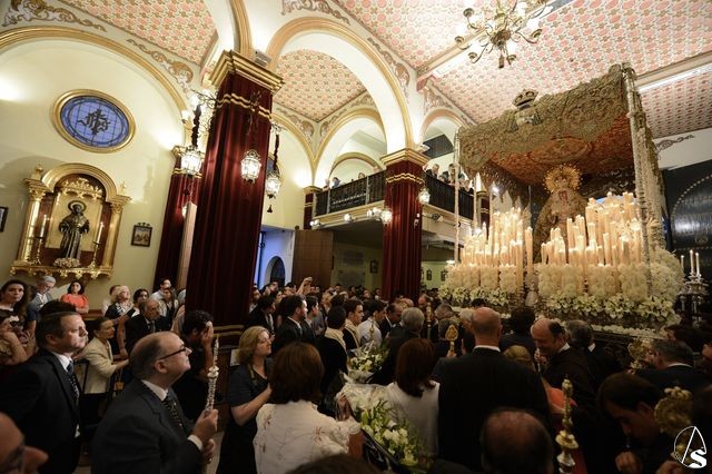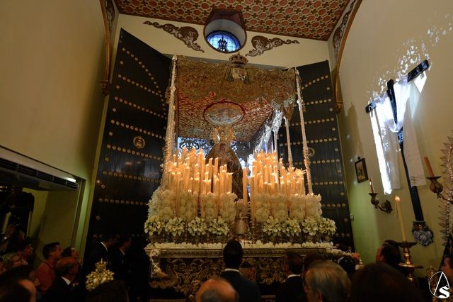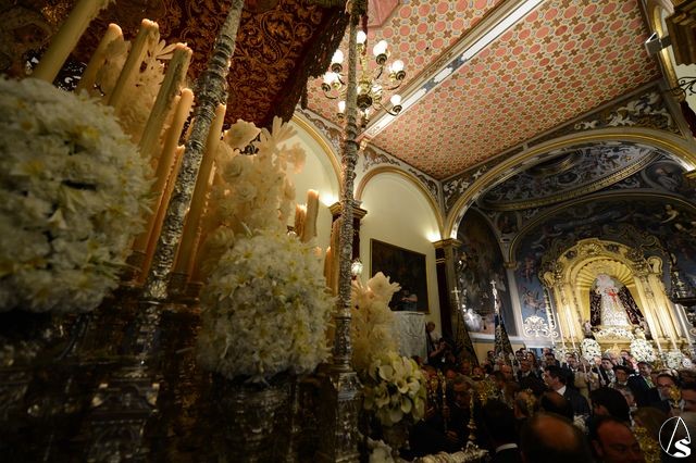En la puerta de la capilla había una alfombra de sal con el escudo de la corporación y las leyendas Reina de los Ángeles y Reina de Sevilla que no fue pisada hasta que llegó el paso. Una vez dentro de la pequeña capilla, el Coro de Jesús Despojado, dirigido por Manuel García Negrete, le cantó el himno de la Macarena que, gracias a los compañeros de Ondaluz que realizaron la retransmisión desde el interior del templo, se pudo escuchar desde la calle, por lo que todo el mundo pudo vivir las emociones que se vivieron dentro.