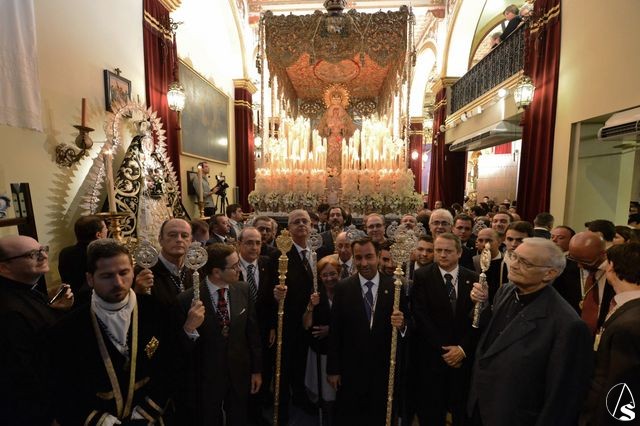 Los titulares de la hermandad del Martes Santo se hallaban en un altar instalado enfrente, junto a la puerta de entrada habitual a la capilla. Una vez dentro el paso se celebró un acto sencillo, donde se rezaron unas oraciones, se entregaron mutuamente unos obsequios y el hermano mayor de los Estudiantes dirigió unas palabras de salutación a la Macarena.