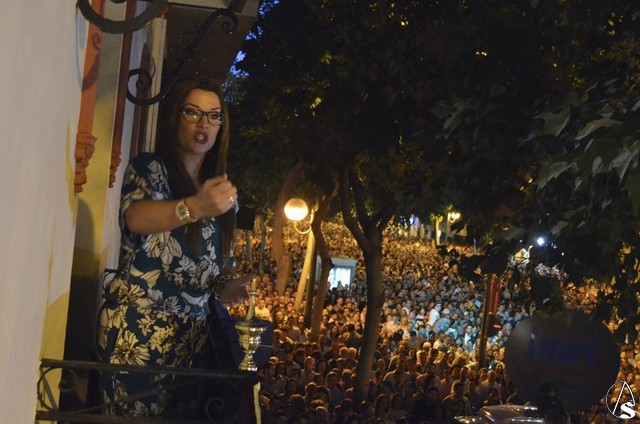A la salida de la capilla de los Ángeles hubo una petalada desde la azotea y desde el balcón de la casa hermandad le cantó una saeta la artista Erika Leiva, finalista de la primera edición de “Se Llama Copla”.