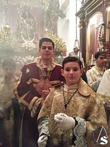 Todos los 12 de octubre por la mañana, no falta a la cita con su Virgen del Rosario de los Humeros... Hermandad a la que pertenece desde que nació y a la que acompaña como acólito o monaguillo. Es un enamorado de la Semana Santa... y quienes le conocemos, nos maravillamos con su impresionante memoria para acertar, sin temor a equivocarse, cualquier parte de una foto donde aparece el más mínimo detalle de un palio.