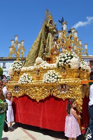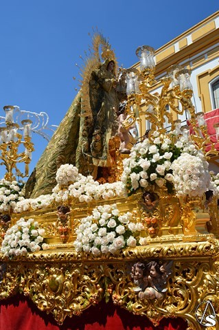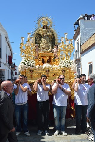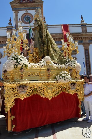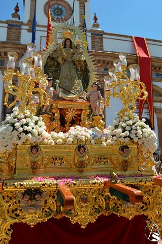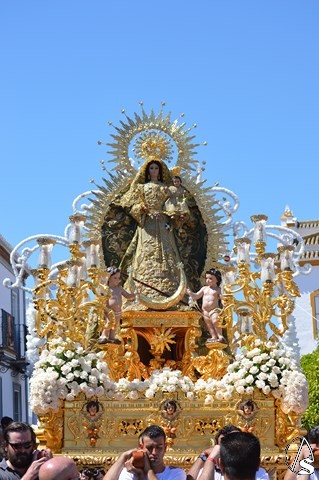 El paso de la Santísima Virgen de la Estrella es de madera tallada y dorada, alumbrado por cuatro candelabros de guardabrisas en las esquinas, el conjunto fue estrenando en 1968. La Virgen lució saya de tono claro bordada en oro y manto de terciopelo verde con bordados en oro estrenando en 1919. Porta la Virgen en su mano derecha cetro y en su mano izquierda sostiene al Santísimo Niño que lució túnica de tono claro bordada en oro. El paso estuvo exornado con rosas blancas. La Banda del Rosario de Sanlúcar la Mayor puso sus sones tras la Virgen de la Estrella.