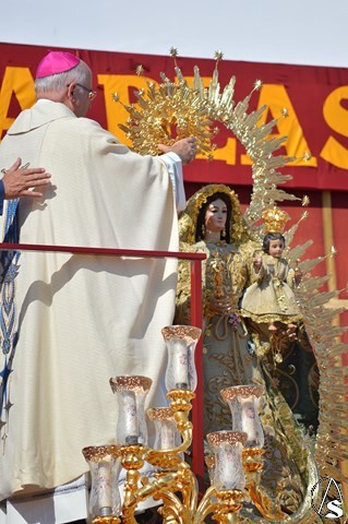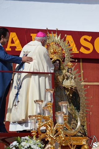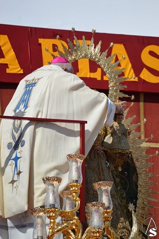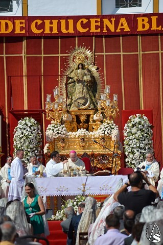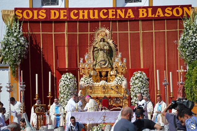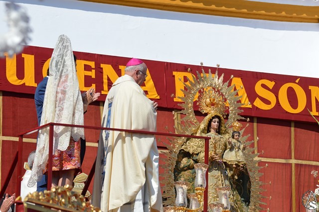 Apenas unos metros la separaban del Altar preparado con tanto amor a su Patrona. Subía lentamente la rampa de acceso mientras se rezaba el Himno de la Coronación por todo el pueblo chucenero. A las 10 de la mañana daba inicio el Pontifical de Coronación Canónica de Nuestra Señora de la Estrella presidido por el Obispo onubense don José Vilaplana Blasco, junto a numerosos sacerdotes. Tras una emotiva homilía, cargada de oración hacia la Santísima Virgen, llegaba el momento más esperado. Los Padrinos acercaron al Obispo las coronas para su bendición y seguidamente el Obispo de Huelva imponía las coronas sobre las sienes de la sagrada imagen, primero al Salvador del mundo y después a la Madre de todos los chuceneros, eran las 10,42 de la mañana cuando las emociones contenidas durante tantos tiempo estallaban como los cohetes que en ese momento en el cielo de este pueblo del Condado de Huelva anunciaban que Nuestra Señora de la Estrella era Coronada.