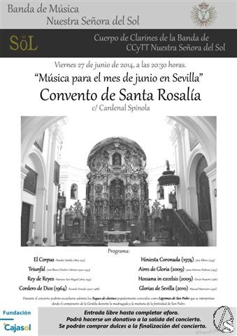 El próximo concierto extraordinario tendrá lugar en la iglesia del Convento de Santa Rosalía (c/ Cardenal Spínola) a las 20,30 horas y en él la Banda de música Nuestra Señora del Sol contará con la colaboración del Cuerpo de clarines de la Banda de Cornetas y Tambores Nuestra Señora del Sol. Como en ocasiones anteriores, se trata de un concierto benéfico a favor de la comunidad religiosa, de clarisas capuchinas en esta ocasión, y la entrada es libre hasta completar aforo. Como siempre, a la salida de cada concierto habrá colocada una hucha en la que el público podrá hacer un donativo que será posteriormente ofrecido a la comunidad. Del mismo modo, se podrán comprar dulces a la finalización del concierto.