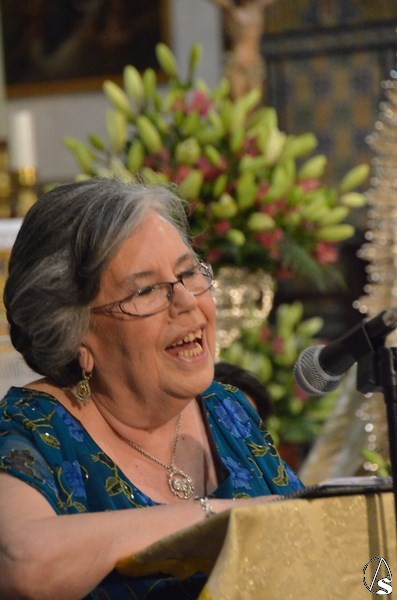 Alegría Roncero hizo un recorrido, a través de sus palabras, por el sentir devocional de esta ciudad a la Virgen María, evocando el esplendor de una Semana Santa que, a pesar de la ausencia de la lluvia salvo el Domingo de Pascua, nos supo a poco, haciendo alusión igualmente al mes de mayo vivido en torno a la Esperanza Macarena con motivo del cincuentenario de su coronación canónica. La pregonera habló de la reconquista de la ciudad por parte de San Fernando, cristianizándola y ofrendándosela a la Madre de Dios, estando muy presente en sus versos la Patrona de esta ciudad y su archidiócesis, la Virgen de los Reyes. Recordó, así mismo, a San Simón Stock y la entrega que a éste le hizo la Virgen en el siglo XIII del santo escapulario, resaltando que quien muera con este fragmento de tela colgado al cuello se librará de padecer el fuego eterno. También quiso rendir homenaje a la devoción del Rosario, al ser la otra titular de la hermandad organizadora del evento. También citó la devoción baratillera de su difunto esposo, y se dirigió al Inmaculado Corazón de María, como vecina que es del barrio de Heliópolis. Pregón poético, sencillo, con mucha historia, con cariño hacia la Virgen y que solamente contó con dos ovaciones al no ser buscadas por la oradora, que permaneció en el atril poco más de media hora.