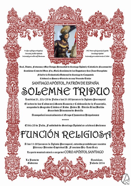 Arte Sacro. El mes de julio en Aznalcázar es sinónimo de Fiesta Grande, ya que celebra con gran intensidad la Festividad de Santiago, el día 25 del mencionado mes. Ya han tenido lugar los actos previos que han consistido en la Verbena popular en el patio de la Casa Hermandad, así como el Pregón de las Fiestas, pronunciado magníficamente este año por D. Manuel Tosar Álvarez, el pasado día 19.