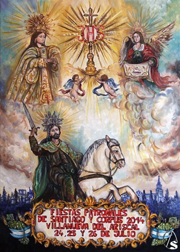 Arte Sacro. El artista local de Villanueva del Ariscal, Fran Cantos, ha sido el encargado por el Ayuntamiento del municipio, de realizar pictóricamente el cartel que anuncia las fiestas Patronales de Santiago y Corpus de la Villa Aljarafeña.