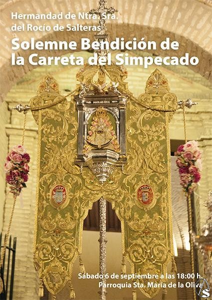 Arte Sacro. El Ayuntamiento de Salteras ha prestado su colaboración a la Hermandad del Rocío en el exorno de las calles del municipio con motivo de la solemne bendición de la Carreta de su Simpecado. El acto, en el que tomará parte la Corporación Municipal presidida por el alcalde de Salteras, Antonio Valverde Macías, se celebrará el próximo 6 de septiembre, a las 18:00 horas, en la Parroquia de Santa Maria de la Oliva. A continuación tendrá lugar la bendición de la Carreta en la Plaza de España y, posteriormente, una procesión por las calles de Salteras -las cuales estarán engalanadas para la ocasión- con el acompañamiento de un grupo de tamborileros.