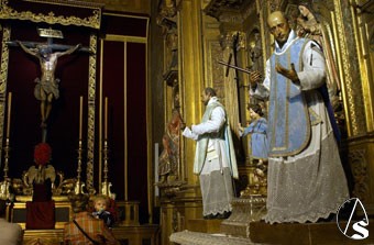EN tiempos de experimentos priostiles practicados por quienes toman lo sagrado como si de gaseosa se tratara, conviene mostrar los dos ejemplos de buen gusto citados en esta página el pasado domingo. Se trata de las imágenes de los santos esculpidos por Juan Martínez Montañés que reciben culto en la Anunciación: San Francisco Javier y San Francisco de Borja, concebidas por el escultor de Alcalá la Real como maniquíes para ser revestidos según la liturgia. A principios de mes, con ocasión de los cultos en honor de la Inmaculada, los dos santos aparecieron ataviados con roquetes y casullas con los colores de la festividad. "El prioste Palomino viste la imaginería de Montañés", podríamos haber titulado el pie de esta fotografía, una instantánea que ofrece además la silueta del Cristo del Amor y una mirada infantil con ansias por descubrir.