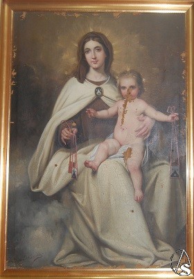 Compositivamente la Virgen se encuentra sentada en una nube con su hijo en su regazo que muestra los brazos abiertos hacia el fiel. Con una mano se dispone a bendecir y con la otra sostiene un escapulario carmelitano, al igual que su madre como corresponde a esta iconografía Mariana. El pintor de la obra, José María Rodríguez Losada (Sevilla, 1826-Jerez de la Frontera, Cádiz, 1896) cultivó la temática de historia, costumbrista, religiosa, literaria y el retrato. Fue caballero de la orden de Santiago y académico correspondiente de la Real de San Fernando de Madrid. Se formó en su ciudad natal. Participó en numerosas muestras y exposiciones, obtuvo mención de honor en las Nacionales de Bellas Artes de 1858 y 1867, respectivamente. Fue premiado con la medalla de plata de Carlos III en la de Sevilla de 1843 y con el máximo galardón en las exposiciones de la Academia de Bellas Artes de Santa Isabel de Hungría de Sevilla de 1854 y 1856, así como en la organizada por la Sociedad de Amigos del País en 1858.