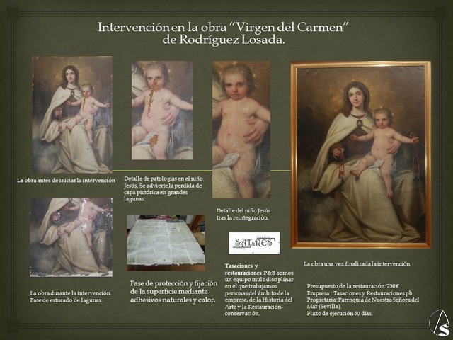 La intervención del cuadro denominado “Virgen del Carmen” perteneciente a la parroquia de Nuestra Señora del Mar, obra firmada del pintor José Rodríguez Losada acaba de concluir en el taller de Jesús Porres. Ha tenido una duración aproximada de 55 días y un presupuesto de ejecución 750 €. La obra que proviene de una familia sevillana que la ha donado a la parroquia presentaba numerosas patologías. En concreto las más llamativas eran las perdidas policromas de parte del cuerpo del niño Jesús así como parte del rostro y la zona inferior del cuadro. La obra se ha procedido a una fijación integral de la capa pictórica, mediante adhesivo orgánico y calor, un nuevo montaje en el bastidor mediante bandas perimetrales que se han adherido a los bordes de la tela original, así como reintegración volumétrica (con estuco) de las lagunas pérdidas que tenia. Por último se ha llevado a cabo la reintegración cromática de las zonas perdidas mediante la técnica del rigattino con materiales reversibles como la acuarela o pigmentos al barniz.