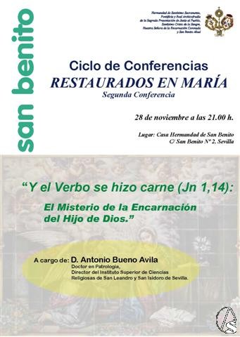 Arte Sacro. Dentro del Ciclo de conferencias "Restaurados en María", informamos que el viernes 28 de noviembre a partir de las 21 horas, en la casa hermandad de San Benito, tendrá lugar la segunda conferencia "Y el Verbo se hizo carne (Jn 1,14): El Misterio de la Encarnación del Hijo de Dios", a cargo de Antonio Bueno Ávila, doctor en Patrología, director del instituto superior de Ciencias Religiosas San Leandro y San Isidoro de Sevilla.