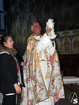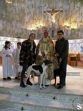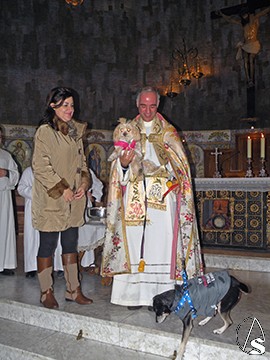 Dado que los animales tienen prohibida su entrada a los templos y por razones meteorológica (lluvia), el acto se celebró dentro de la parroquia. Así, tras una pequeña oración el párroco Ignacio acompañado de su sacristán Antonio Vargas y con el hisopo de las bendiciones, roció con el agua bendita a las distintas mascotas de la feligresía que se acercaron a la cita en el altar mayor, como tortugas, perros, conejos, ratones blancos, gatos, pájaros y de todas clases y razas en compañía de sus dueños que este domingo tuvo una masiva asistencia.